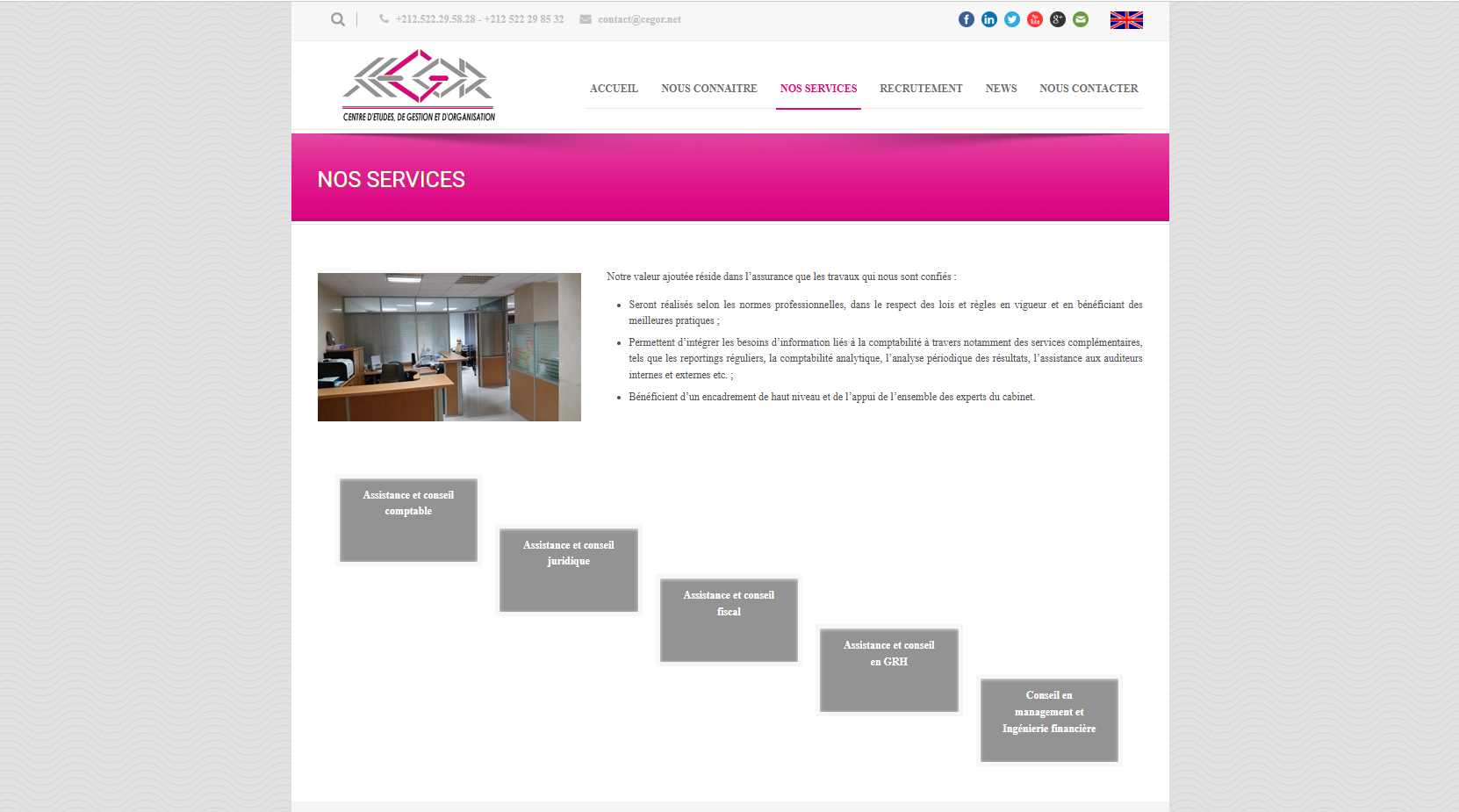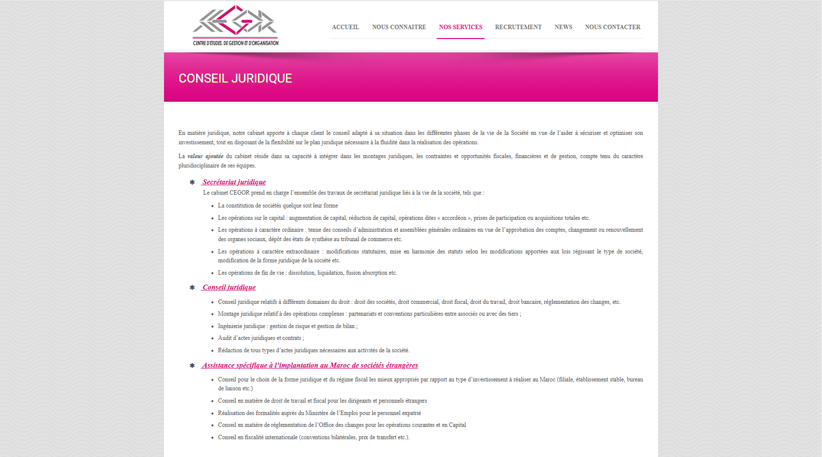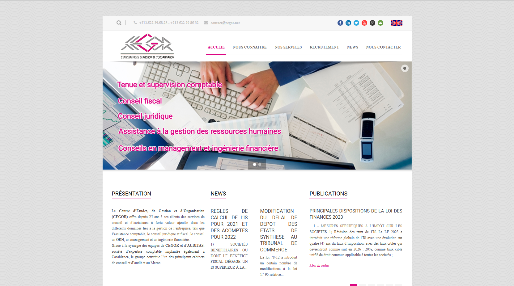 Le Centre d’Etudes, de Gestion et d’Organisation (CEGOR) offre depuis 25 ans à ses clients des services de conseil et d’assistance à forte valeur ajoutée dans les différents domaines liés à la gestion de l’entreprise, tels que l’assistance comptable, le conseil juridique et fiscal, le conseil en GRH, en management et en ingénierie financière.