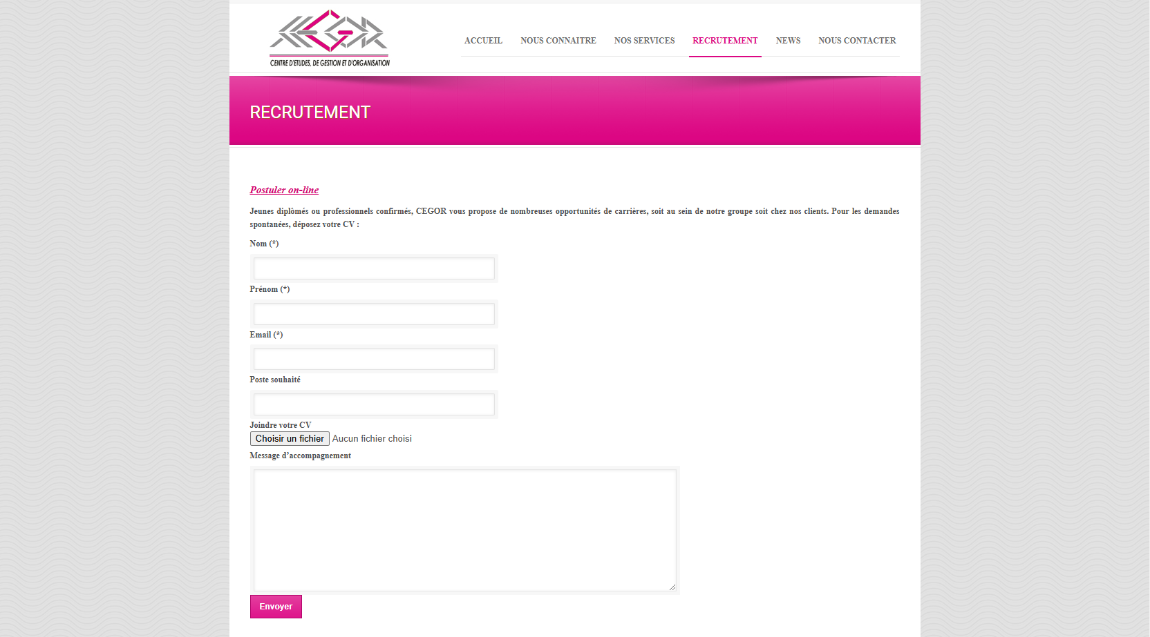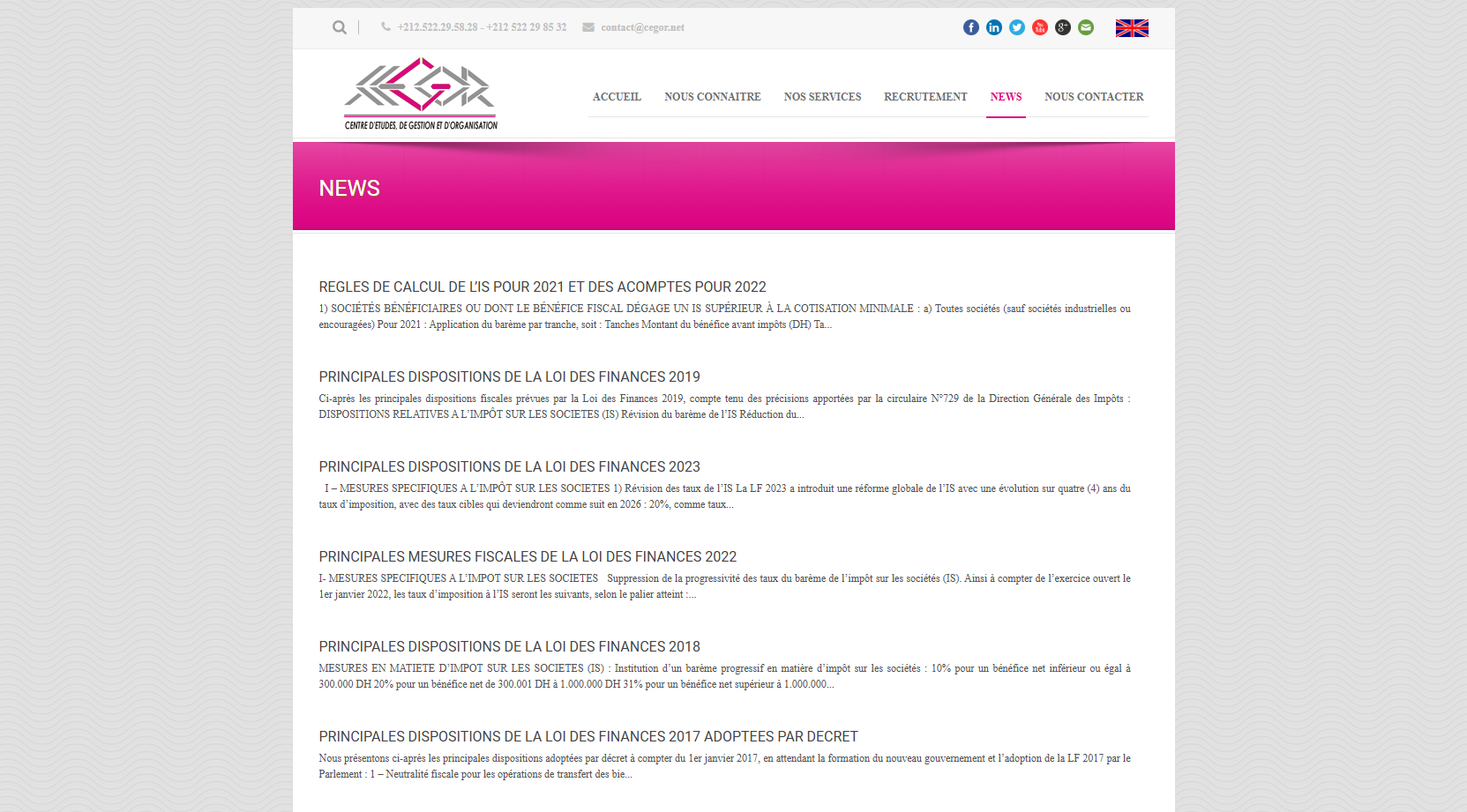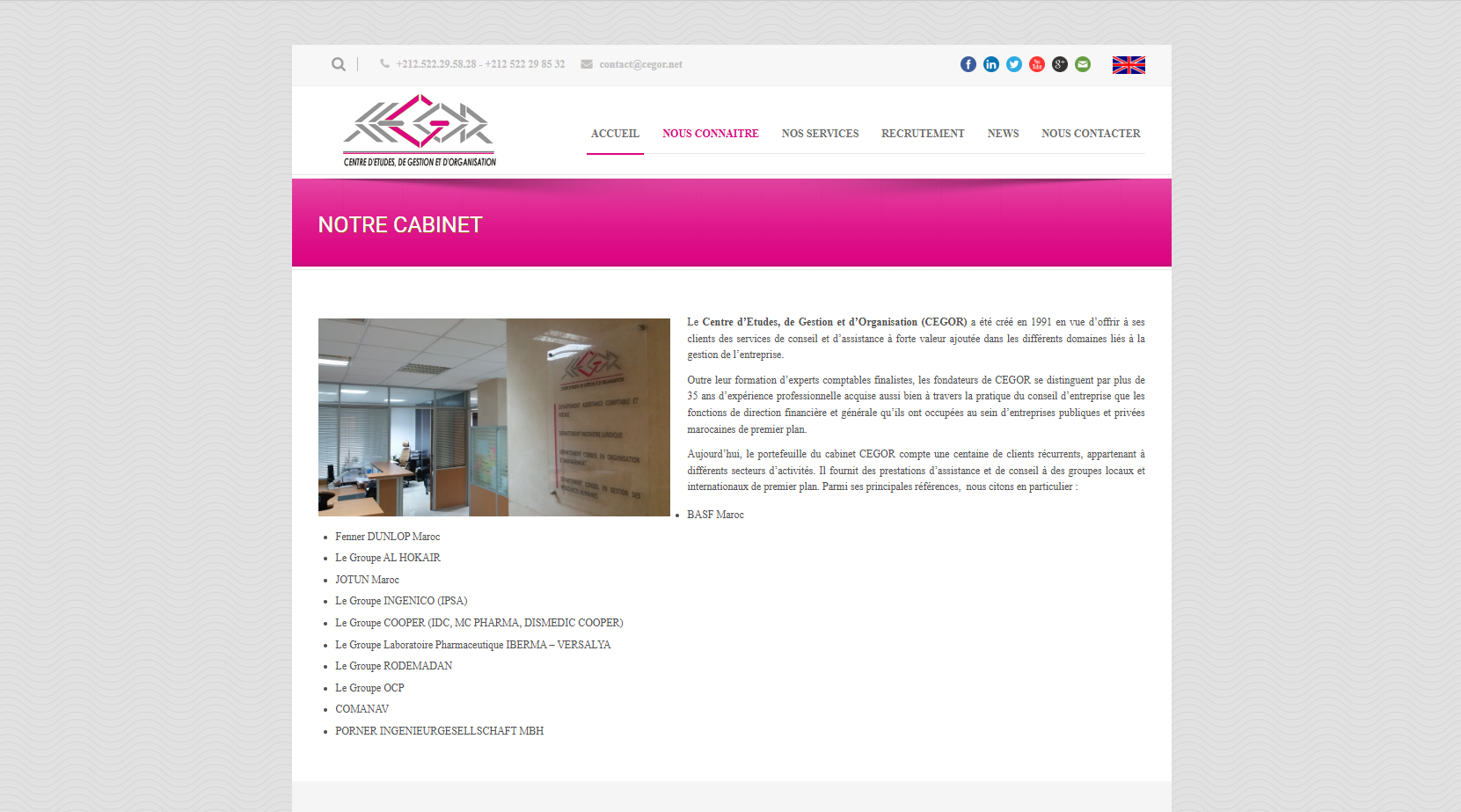Le Centre d’Etudes, de Gestion et d’Organisation (CEGOR) offre depuis 25 ans à ses clients des services de conseil et d’assistance à forte valeur ajoutée dans les différents domaines liés à la gestion de l’entreprise, tels que l’assistance comptable, le conseil juridique et fiscal, le conseil en GRH, en management et en ingénierie financière.