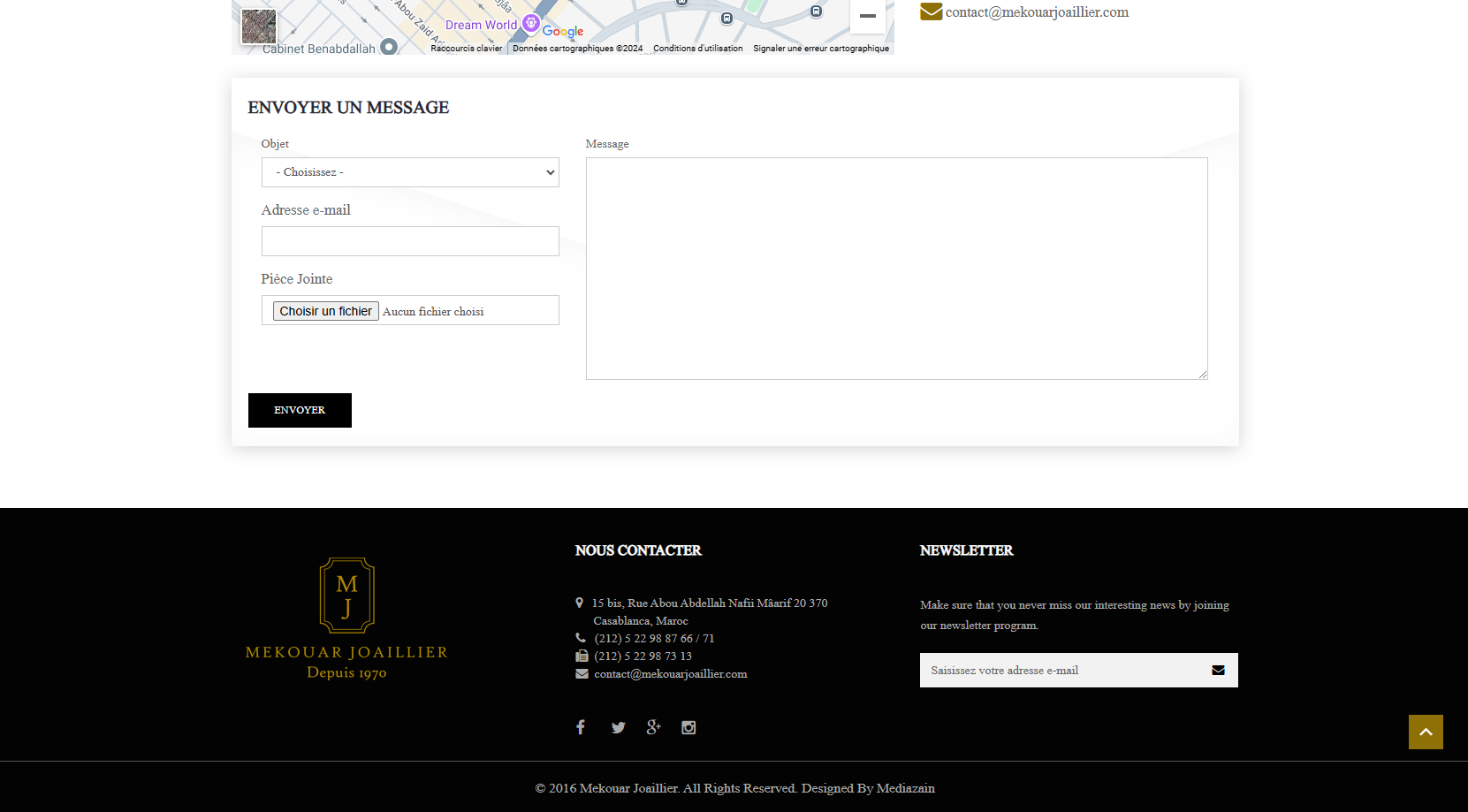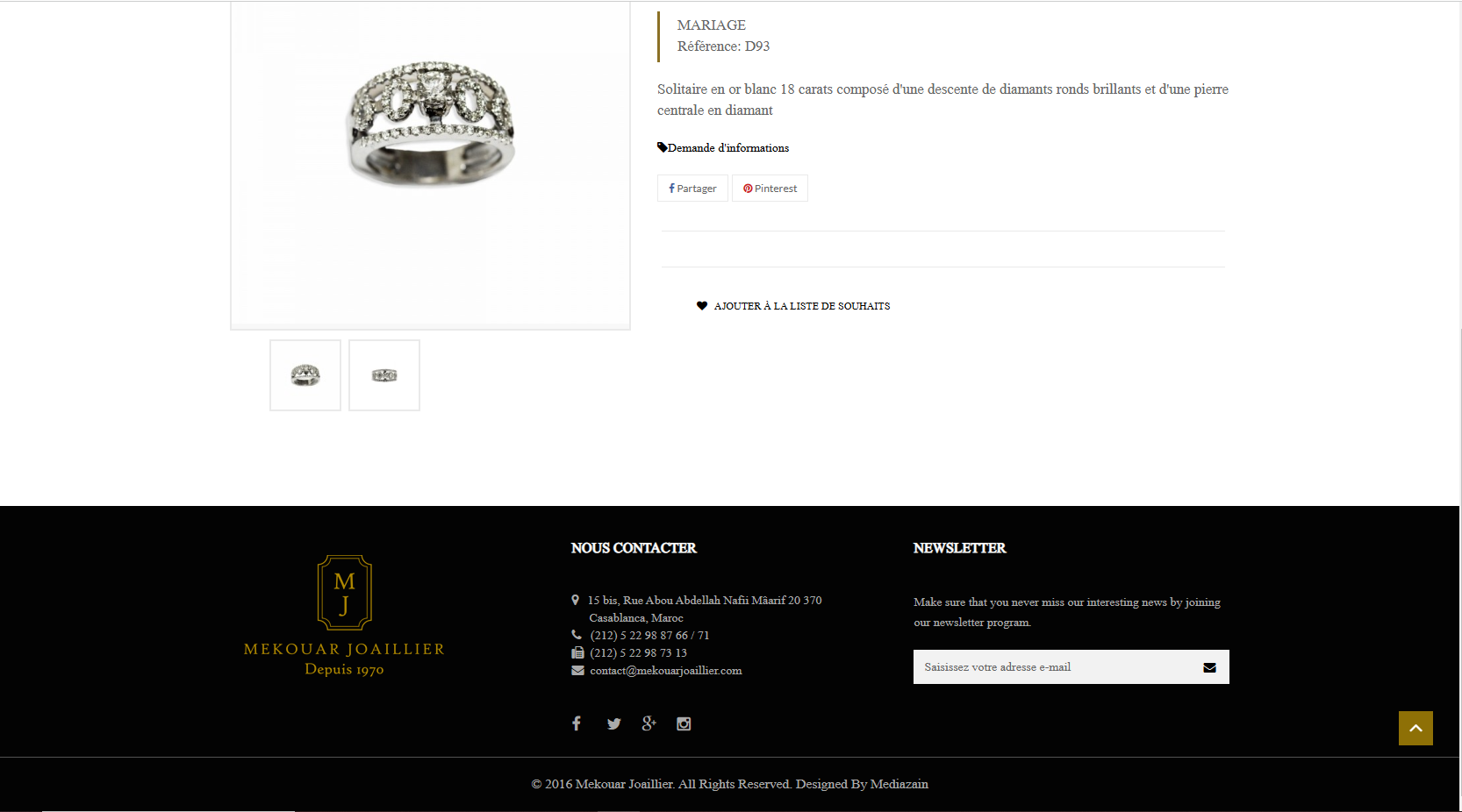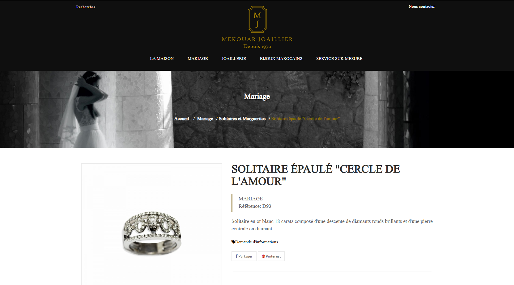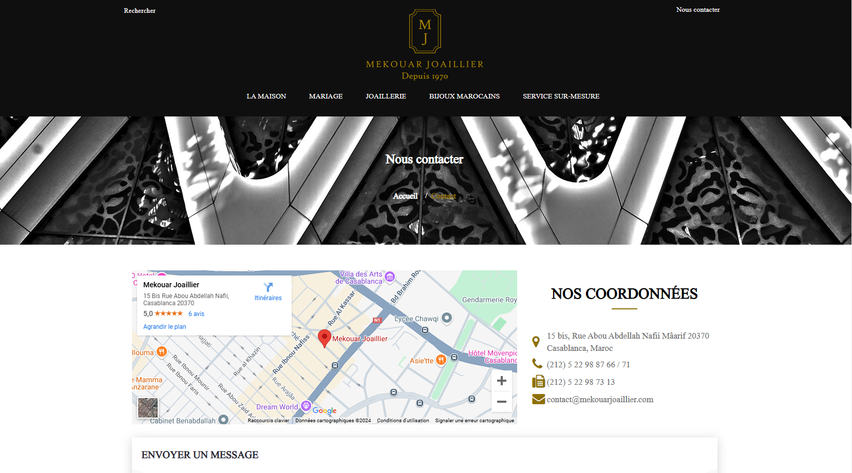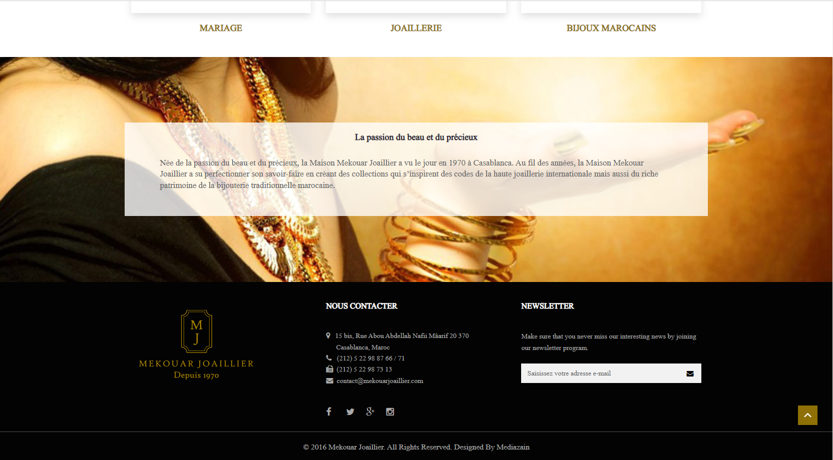 Née de la passion du beau et du précieux, la Maison Mekouar Joaillier a vu le jour en 1970 dans le quartier des bijoutiers sise Rue de Rabat à Casablanca. Au fil des années, cette entreprise familiale, dirigée par M. Abdelouahab Mekouar, connait un fort développement et acquis une solide réputation dans le secteur de la bijouterie au Maroc. La boutique “Flagship” de la Maison a depuis élu domicile au quartier Mâarif à Casablanca.