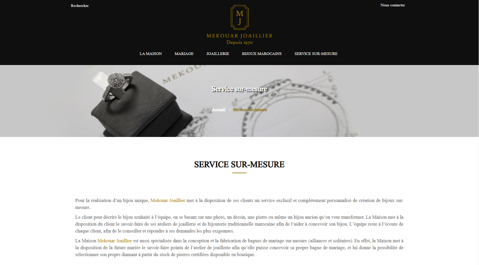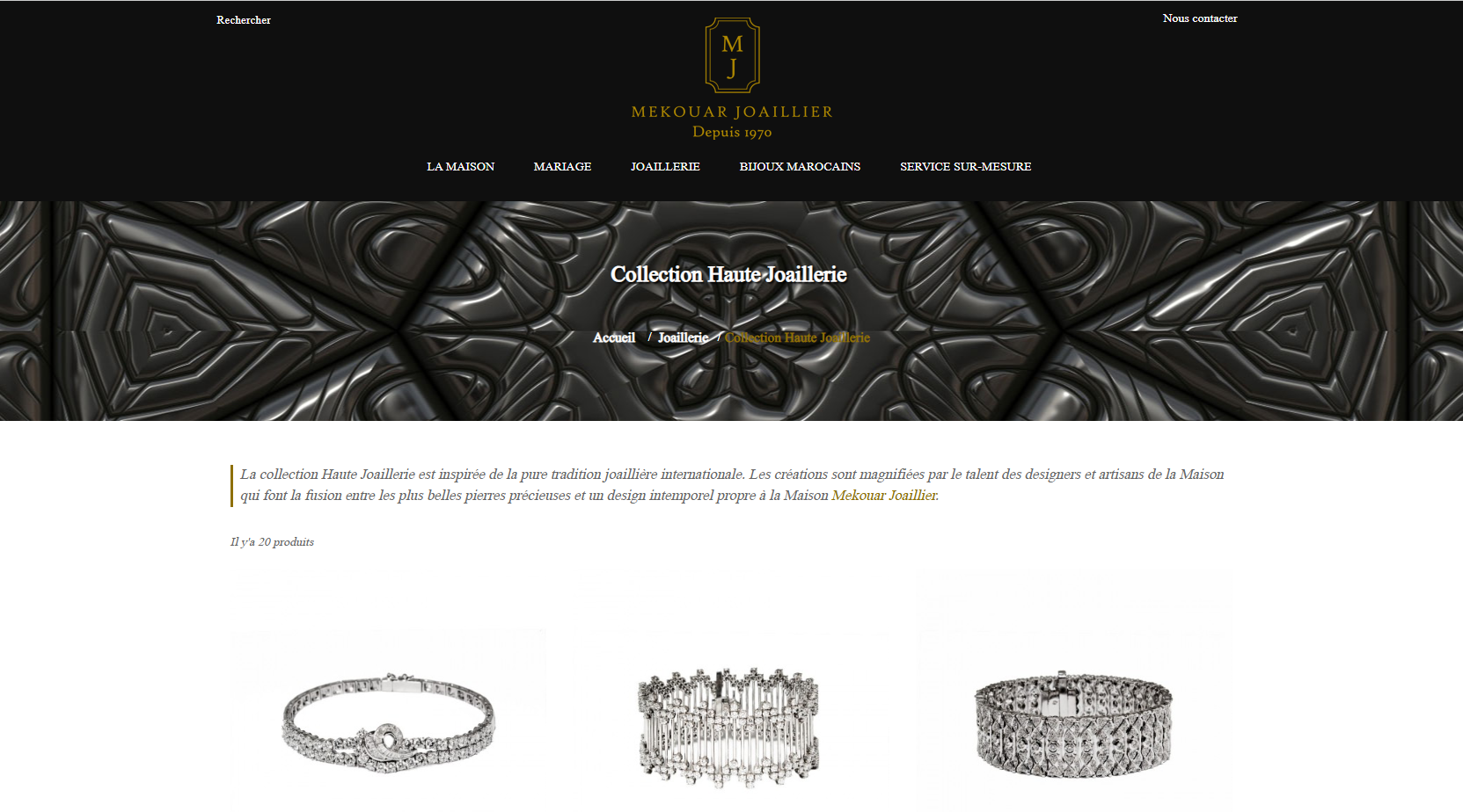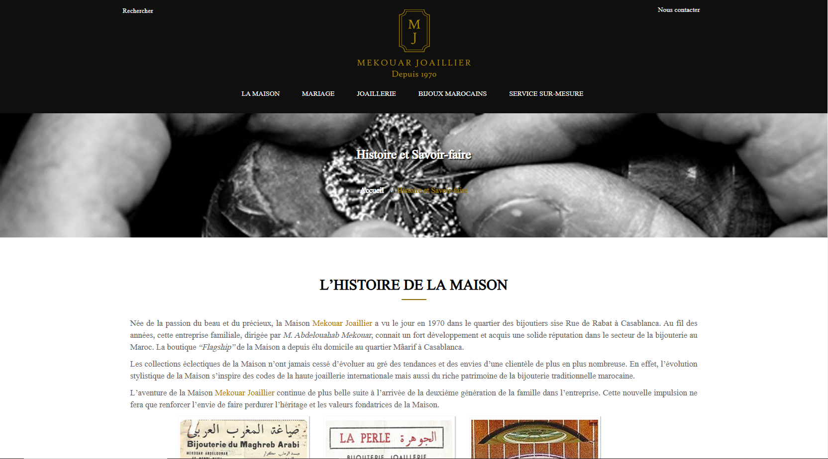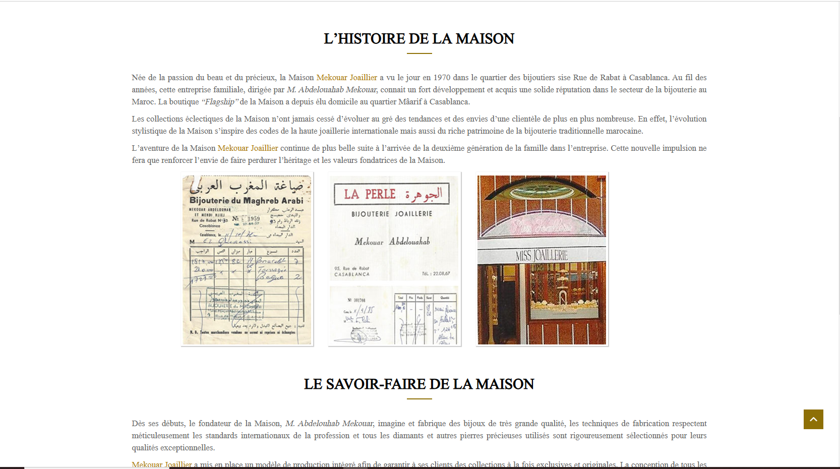 Dès ses débuts, le fondateur de la Maison, M. Abdelouhab Mekouar, imagine et fabrique des bijoux de très grande qualité, les techniques de fabrication respectent méticuleusement les standards internationaux de la profession et tous les diamants et autres pierres précieuses utilisés sont rigoureusement sélectionnés pour leurs qualités exceptionnelles.